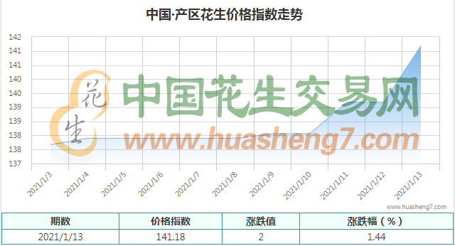 本日產區花生指數:141.18,較昨日上漲2點,漲幅為1.44%。