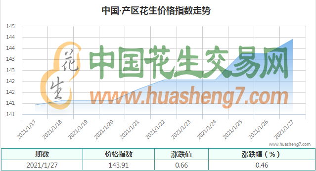 本日產(chǎn)區(qū)花生指數(shù):143.91,較昨日上漲0.66點,漲幅為0.46%。