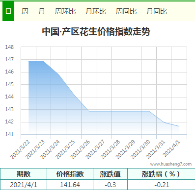 本日產(chǎn)區(qū)花生指數(shù):141.64,較昨日下跌0.3,跌幅0.21%。