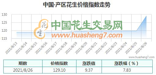 本日產區花生指數:129.10,較昨日上漲9.37,漲幅7.83%。